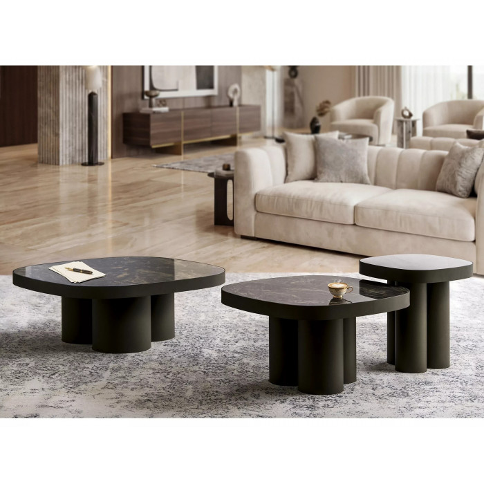 Журнальний столик, стільниця: іспанська кераміка Vulcano, каркас: метал, колір: глянцевий чорний / мідний.