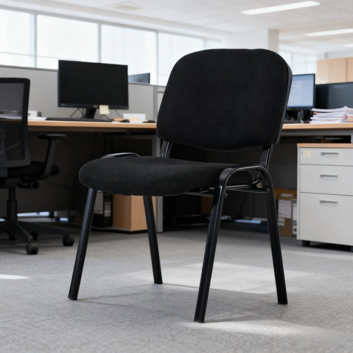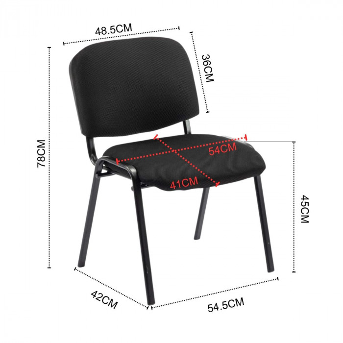 Матеріал крісла: тканина Каркас: метал 1,1-1,2 мм Колір: чорний Висота: 77 см Висота до сидіння: 45 см Ширина: 54,5 см Ширина сидіння: 54 см Глибина: 42 см Глибина сидіння: 41 см Додаткова інформація: піна високого та змішаного типу щільності, сертифікація SGS, штабелюються. Призначення використання: в приміщенні MAX навантаження на стілець: 200 кг Гарантія від виробника: 3 роки Розмір упаковки: без упаковки, з поліпропіленовим пакетом