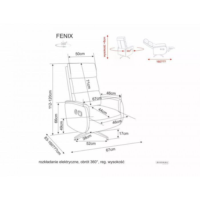 Крісло з електроприводом відкидання, тканина: Raven, колір: темно-бежевий 30, каркас: метал, колір: чорний. Сидіння, що обертається на 360 градусів, регульована висота сидіння. Розміри крісла: A - 112–120, B - 67, C - 49–57, D - 44, E - 83–162, F - 17 см.