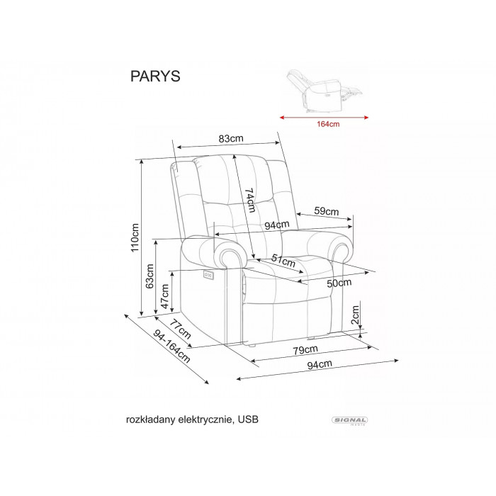 Електричне крісло-реклайнер, тканина: Raven, колір: темно-бежевий 30. USB-порт. Розміри крісла: A - 110, B - 94, C - 47, D - 51, E - 94÷164 см.