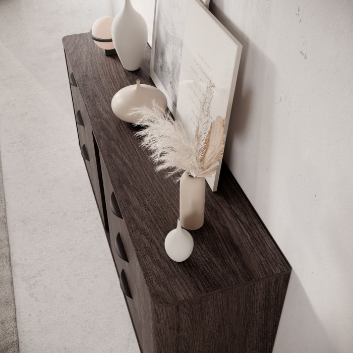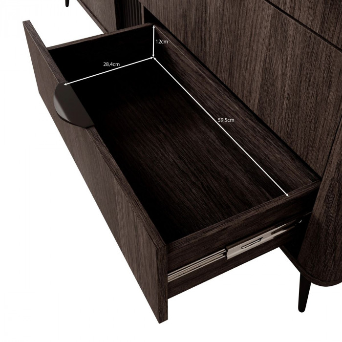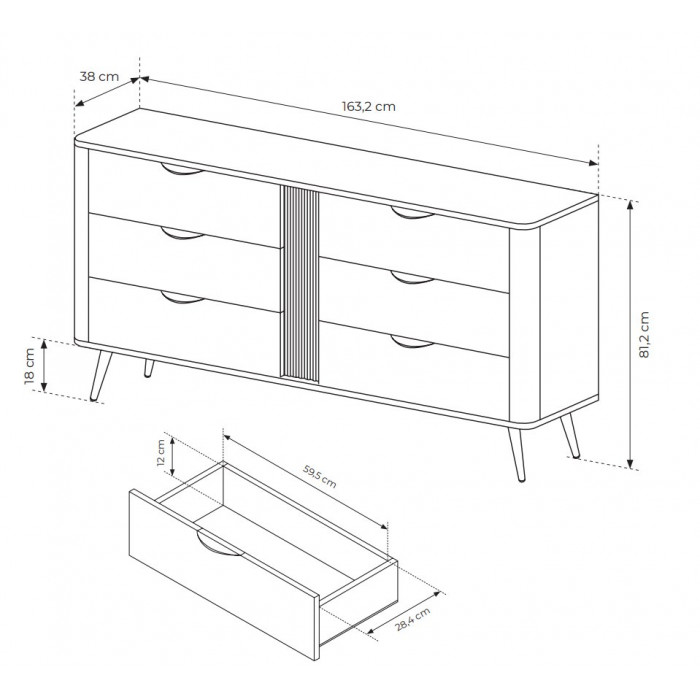 Комод Veris 6S 163 – максимум зберігання Комод Veris 6S 163 у сучасному поєднанні дуба Дунин і чорних деталей – відмінне рішення для великої родини. Шість висувних шухляд дозволяють зручно зберігати одяг, білизну і аксесуари, а строгий дизайн робить його універсальним для будь-якої кімнати. Розміри: Висота: 81,2 см Ширина: 163,2 см Глибина: 38 см Корпус і фасад із ламінованої ДСП і МДФ з металевими ручками й направляючими забезпечують гладке ковзання й довговічність. Простора внутрішня організація й лаконічний дизайн роблять цю модель популярним вибором для великих приміщень. Зверніть увагу: відтінки на фото можуть відрізнятися від реальних через налаштування екрану. Купуйте комод Veris 6S 163 з доставкою по Україні – стильне та функціональне рішення!