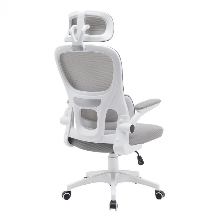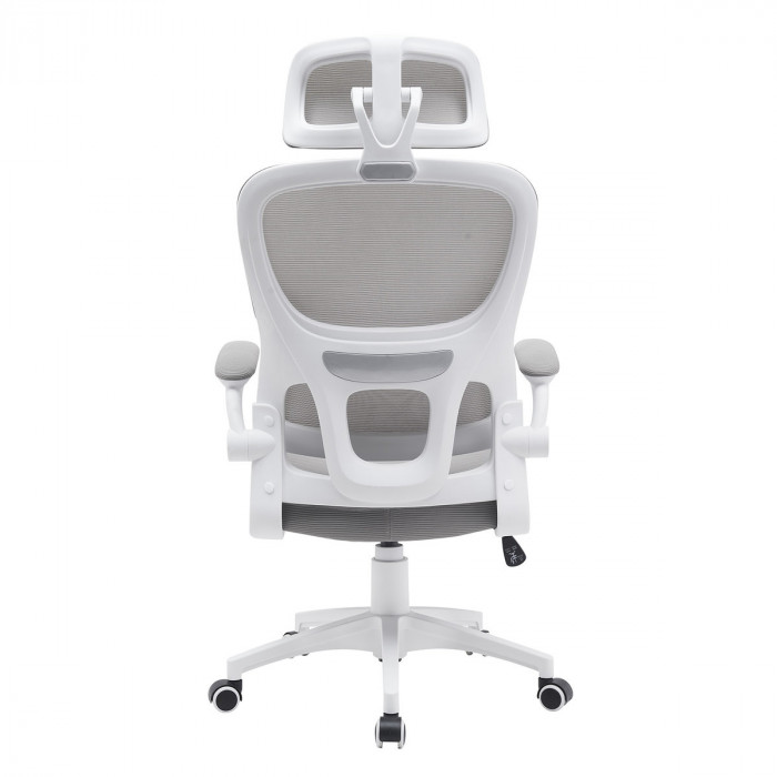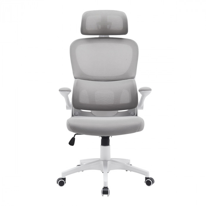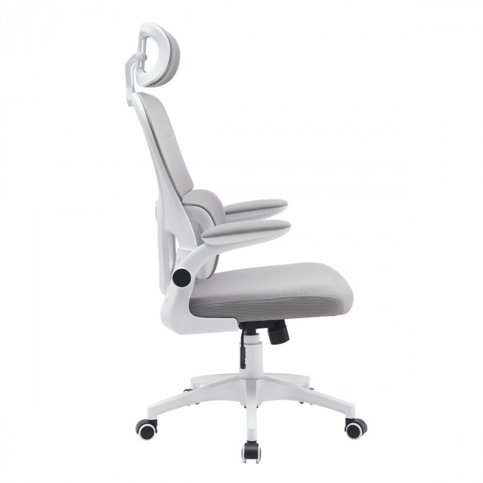 Матеріал крісла: Мембранна тканина-сітка, Колір: сірий, Каркас: білий Додаткова інформація: механізм TILT, рухомі (відкидні) підлокітники, високоякісний газліфт, міцна нейлонова основа, безшумні нейлонові колеса, максимальне навантаження 120 кг Розмір коробки: 61*31,5*59 см