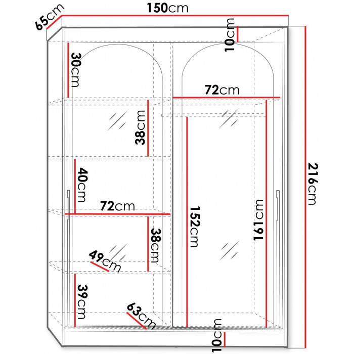 Шафи є незамінним елементом будь-якого інтер'єру. Це стосується практично кожної кімнати, незалежно від того, чи це передпокій, чи спальня. Цей тип меблів визначає організацію та естетику певного простору. Для виробника шаф проектування такого типу меблів є завданням, яке вимагає врахування багатьох факторів. Це включає, серед іншого, такі важливі фактори, як практичність, ергономіка та естетика. Тому варто звернути увагу на особливості шаф, які дозволять вам урізноманітнити вашу пропозицію з точки зору якомога ширшої цільової групи клієнтів. Колір: чорний/чорний (золота ручка) Ширина: 150 Висота: 215 Глибина: 65 Додаткова інформація: ЛДСП 16 мм, крайка ABS, пластикова ручка, розсувна алюмінієва система LAGUNA з регулюванням, направляюча рейка монтується до нижньої частини шафи. Розміри коробок: 4,8*65*221 см + 9,6*69*153 см + 4,5*81*206 см